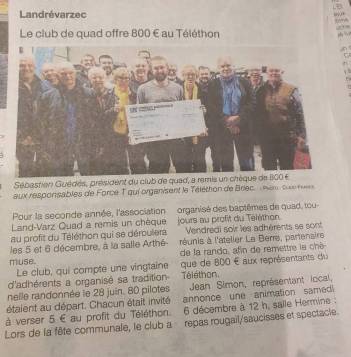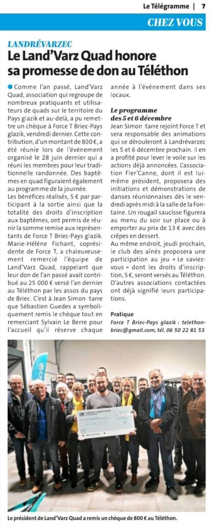 Pour la seconde année l’association Land Varz Quad a remis, vendredi 14 novembre 2025, à l’atelier Le Berre de Landrévarzec, un chèque de 800 € pour l’AFM Téléthon aux représentants de l’association Force T Pays glazik de Briec et Landrévarzec. Cette somme a été recueillie lors de la randonnée annuelle de Land Varz Quad, le 28 juin 2025. Pas moins de 80 quads et motos avaient participé à cette journée festive, où étaient aussi proposés des baptêmes de quad enfants et adultes.